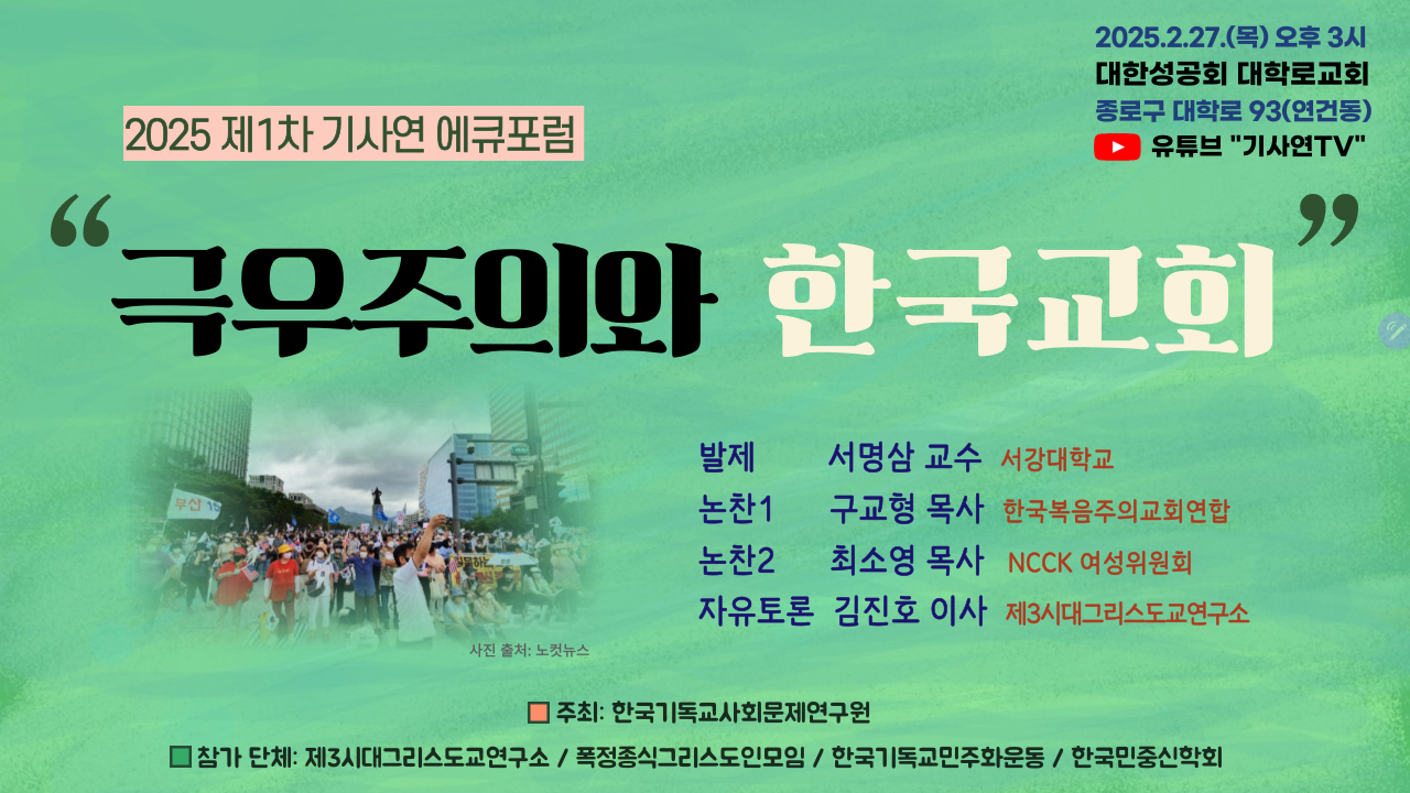 • 유튜브 생중계 “기사연TV” [2025 제1차 기사연 에큐포럼] “극우주의와 한국교회” – YouTube